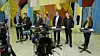 Sjeldent syn. Sju partier, representert ved (fra venstre) Kjell Ingolf Ropstad (KrF), Arild Hermstad (MdG), Sveinung Rotevatn (V), Freddy Andre Øvstegård (SV), Tor Inge Eidesen (Sp), Henrik Asheim (H) og Tuva Moflag (Ap) under en felles pressekonferanse i Vandrehallen etter at et flertall på Stortinget har blitt enige om et forlik om en ny pensjonsreform.
