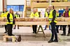 Landbruksminister Sandra Borch (Sp) og statsminister Jonas Gahr Støre (Ap) besøkte Moelven Industrier fredag og fikk se en gigantisk bjelke i limtre.