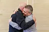 Lederen i Transportarbeiderforbundet, Lars Johnsen (t.v) og lederen i Fellesforbundet, Jørn Eggum, gir hverandre en klem etter å ha signert en avtale om sammenslåing av Transportarbeiderforbundet og Fellesforbundet.