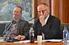 LOs sjeføkonom Stein Reeggård briefet pressen om deres oppfatning av utviklingen i norsk økonomi onsdag. Eystein Gjelsvik i bakgrunnen.