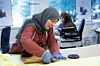 SMITTEVERNSFRAKK: Fatima Malala klipper til bomullsstoff til en smittevernsfrakk.