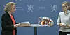 ARbeidsminister Anniken Hauglie mottar Arbeidstidsutvalgets rapport av utvalgsleder Karen Helene Ulltveit-Moe.