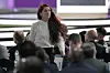 Lise Klaveness på vei ned fra talerstolen etter å ha snakket til FIFA-toppene midt imot.