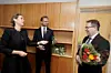 Nøkkeloverrekkelse i Kommunaldepartementet mellom avtroppende kommunalminister Nikolai Astrup (H) og påtroppende Bjørn Arild Gram (Sp). Til venstre står avtroppende distrikts- og digitaliseringsminister Linda Hofstad Helleland (H).