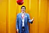 Tidligere skøyteløper Johann Olav Koss fotografert på Scandic Edderkoppen i forbindelse med et foredrag om Right To Play-prosjektet han driver i 23 land. Smilende bilde mens han kaster en rød ball, gul bakgrunn.