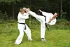 Thomas Lund Nielsen (t.h) har fått trent viljestyrken sin som karateutøver. Her er han i aksjon i en karatedemonstrasjon utendørs.