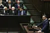 Polens president Andrzej Duda taler til det polske parlamentet, mens partiformann i Lov- og rettferdighetspartiet, Jarosław Kaczyński - mannen mange mener har den reelle makten i landet, følger med fra sidelinjen.