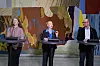 Tuva Moflag (Ap), Kristi Bergstø (SV) og André Myhrvold (Sp) under pressekonferanse på Stortinget etter SV og regjeringspartiene kom søndag til enighet om statsbudsjettet for 2025.
