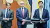 Fra venstre: Saksordfører Grunde Almeland (V) offentligjør innstillingen i habilitetssakene, som Kontroll- og konstitusjonskomiteen har jobbet med siden juli i fjor. I midten står Aps Frode Jacobsen og helt til venstre Høyres Peter Frølich.